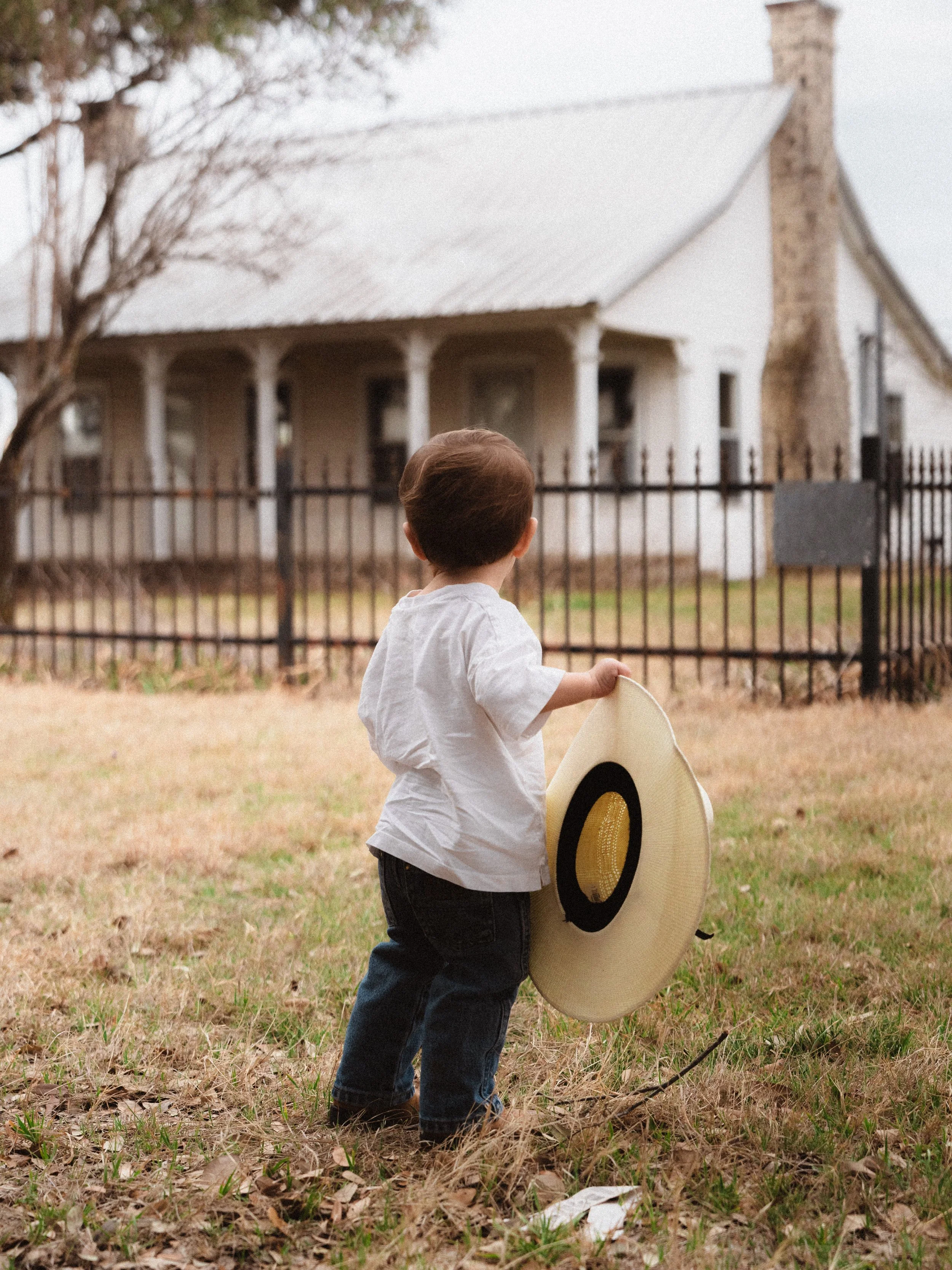 Two acres on the outskirts of a small Texas town. Hundreds-of-years-old oak trees standing tall and patient, their branches stretching wide as if they have already seen generations pass beneath them. An old farmhouse from 1887, weathered but dignified. A metal barn with good bones and honest lines. A small rock house that feels almost storybook in its simplicity.